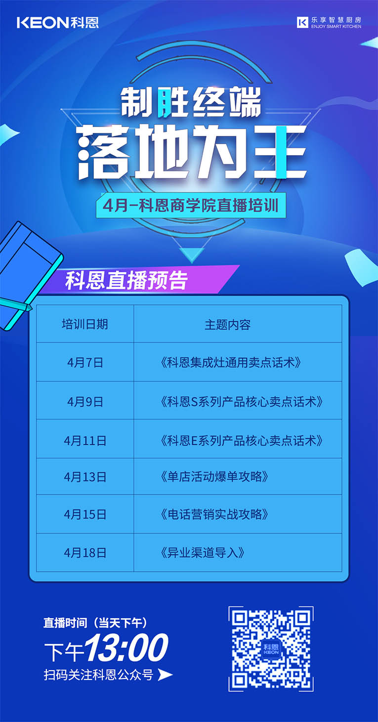 勤修內(nèi)功,強(qiáng)化技能,提升自我!集成灶十大品牌、廚電行業(yè)十大品牌科恩集成灶4月線上直播培訓(xùn)總覽,儲(chǔ)備知識(shí),保障團(tuán)隊(duì)凝聚力和戰(zhàn)力力,上下齊心,打造黃金團(tuán)隊(duì),擴(kuò)大品牌影響力!