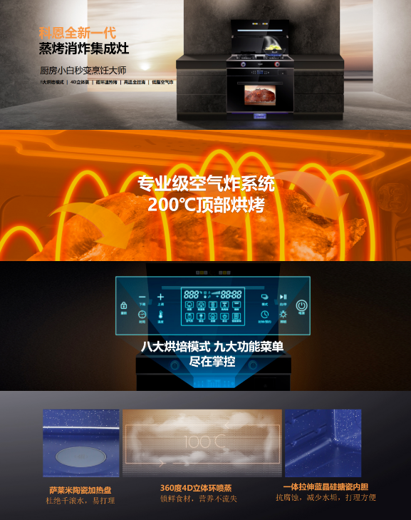 除了在外形上的顛覆常規(guī)、以型造境之外,C系列集成灶在功能實(shí)用上的優(yōu)勢(shì)也可圈可點(diǎn),以C260蒸烤消炸集成灶為例,集鮮蒸、嫩烤、消殺、空氣炸于一體,美味健康四合一。八大烘焙模式、九大功能菜單、4D立體蒸、循環(huán)速熱烤、高溫全腔消、低脂空氣炸,自動(dòng)烹飪,輕松上手,一臺(tái)科恩C260集成灶頂?shù)昧艘粋€(gè)專業(yè)級(jí)烹飪大師,實(shí)在令人心動(dòng)!