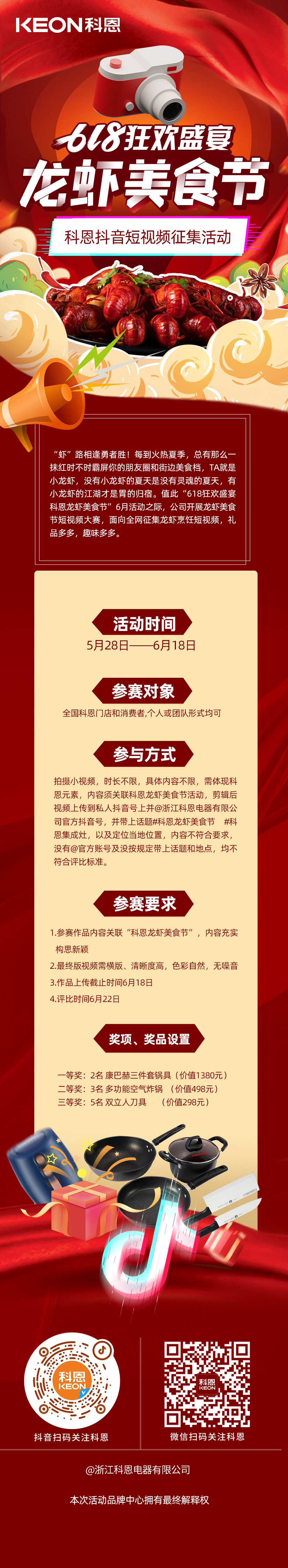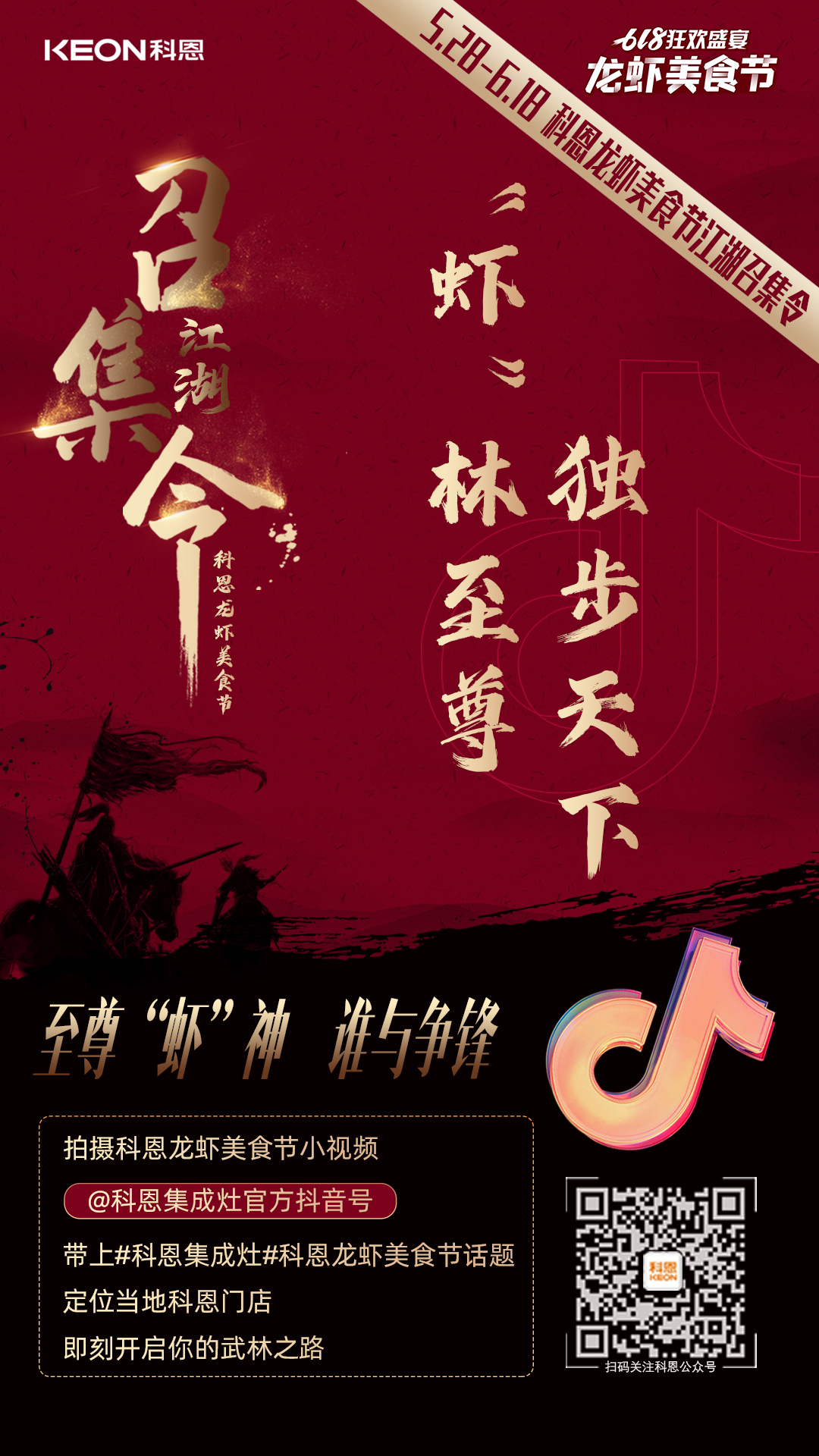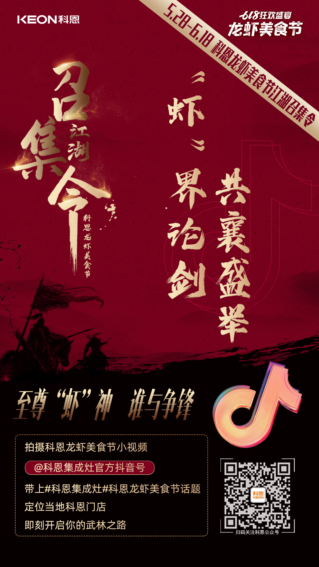 各位俠士,請妥存這份武林大會規則寶典,江湖美味,缺你不可!只要關聯科恩龍蝦美食節,體現科恩元素并上傳至私人抖音號,@浙江科恩電器有限公司官方抖音號,帶上話題#科恩龍蝦美食節 #科恩集成灶,定位當地科恩門店位置即可!