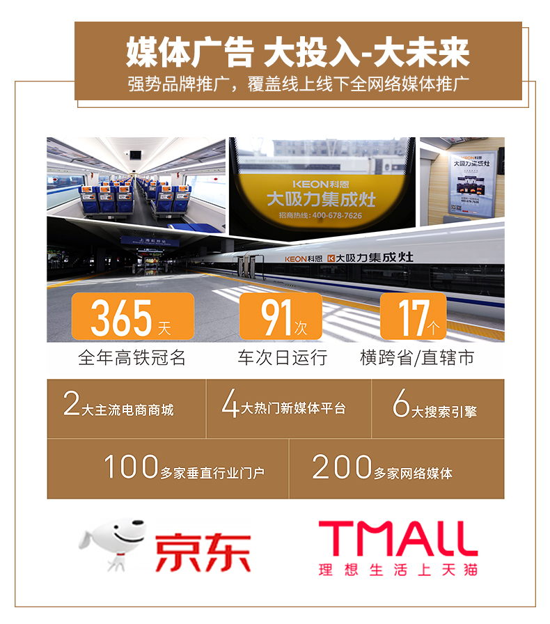 科恩集成灶自2021年以來全力加速品牌推廣進程,大手筆投放高鐵廣告,斥巨資全年冠名——“科恩號”高鐵品牌專列:橫跨17個省/直轄市,日運行91車次,傳播面積之廣,受及群眾之多,在消費者心目中有著極強的影響力和公信力,借助高鐵“國家名片”屬性為品牌權威背書,讓“集成灶就選科恩大吸力”口號傳遍大江南北!如今,科恩電器再次重磅出擊,攜手嵊新高鐵站,強勢霸屏其黃金廣告C位,精準覆蓋,持續品牌形象建設,為品牌傳播助力加碼,實力詮釋“科恩速度”!