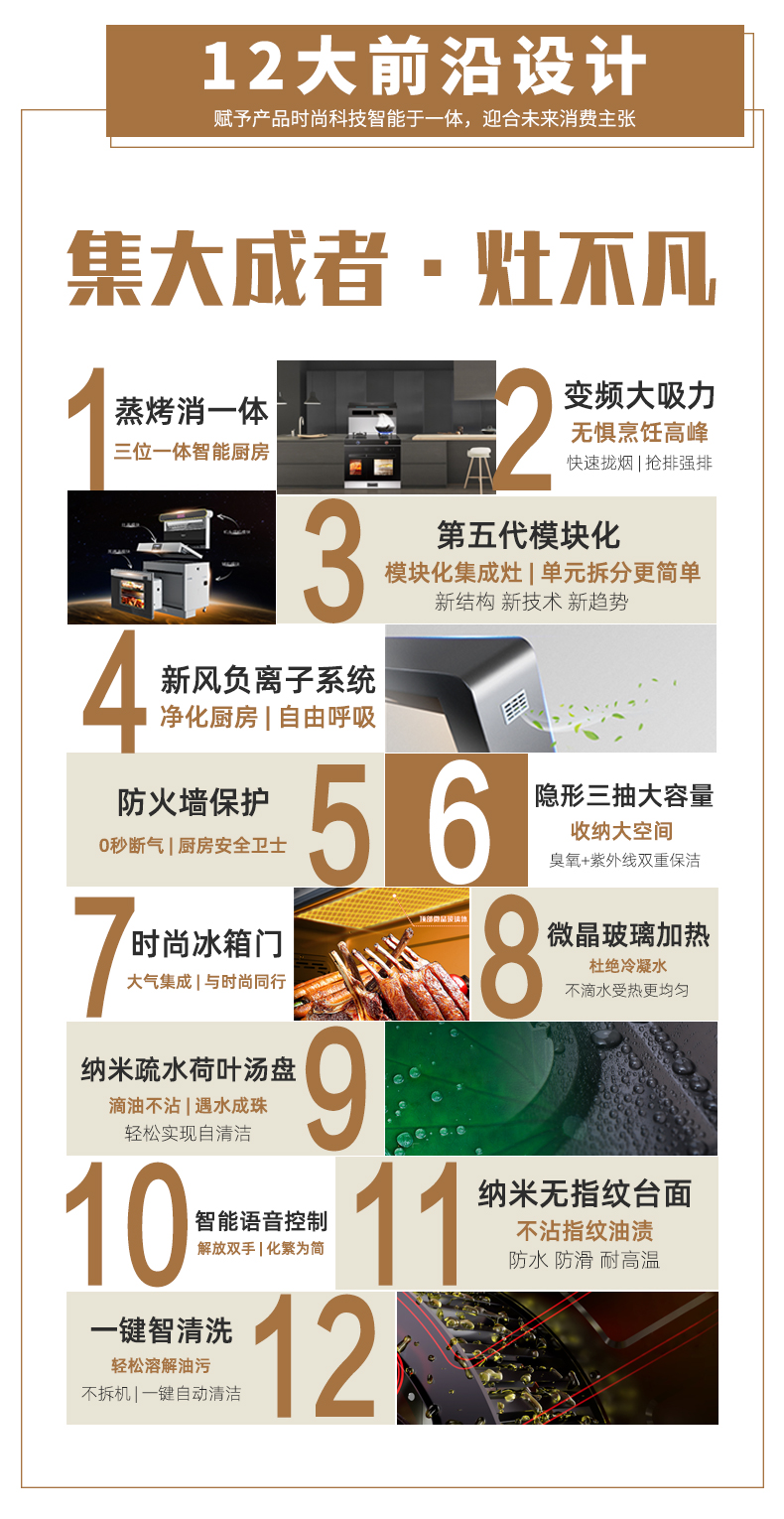產品好不好,要看用戶的滿意度,科恩集成灶時刻洞察用戶需求變化,在產品研發上不斷發力,以變頻大吸力、第五代模塊化、智能語音互聯、蒸烤消一體、左右蒸烤、微晶玻璃加熱、納米疏水荷葉湯盤、納米無指紋臺面、一鍵智清洗等12大差異化前沿技術,實現多項性能提升突破,為用戶帶去“樂享智慧烹飪”廚房新體驗。