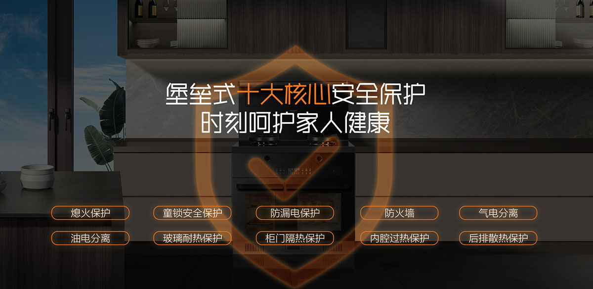 堡壘式十大核心安全保護,時刻呵護家人健康(熄火保護、童鎖安全保護、防漏電保護、防火墻、氣電分離、油電分離、玻璃耐熱保護、柜門隔熱保護、內(nèi)腔過熱保護 、后排散熱保護)