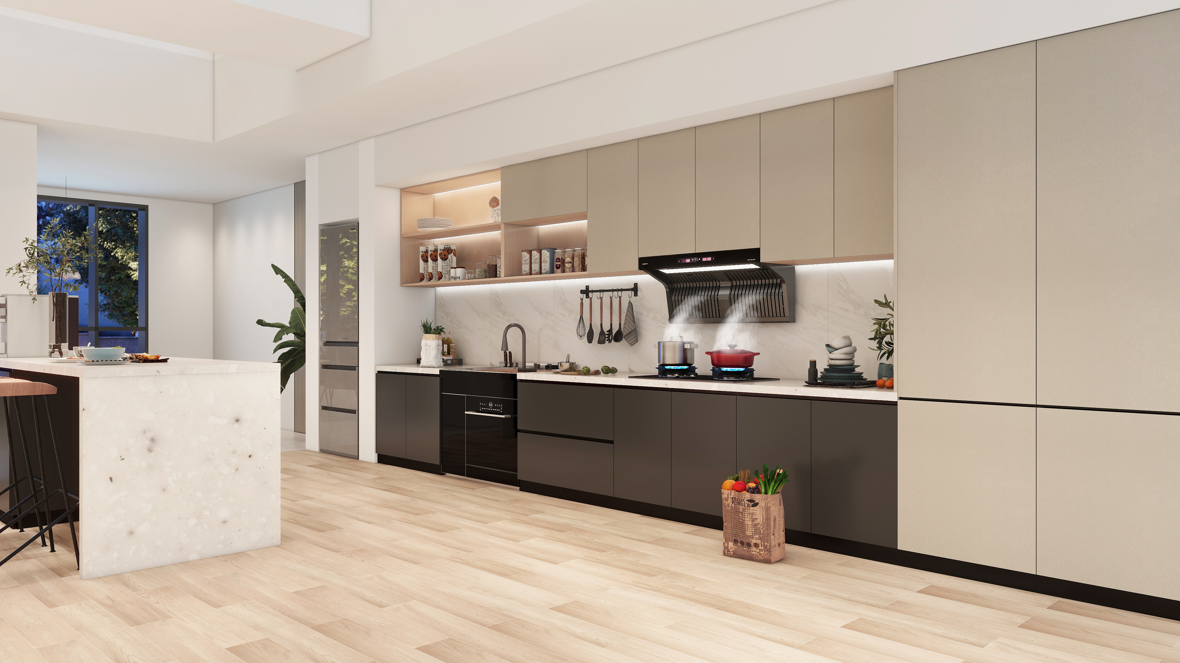 年輕一代都偏愛,半開放式及開放式廚房。一是考慮到美觀度,還有一個就是陪伴!相對于老一代悶聲在廚房烹飪,年輕一代更喜歡在烹飪的時候與家人、朋友一起聊聊天。在這種新生的趨勢中,人們對廚房的期待,已經不僅是為了忙活出一頓飯