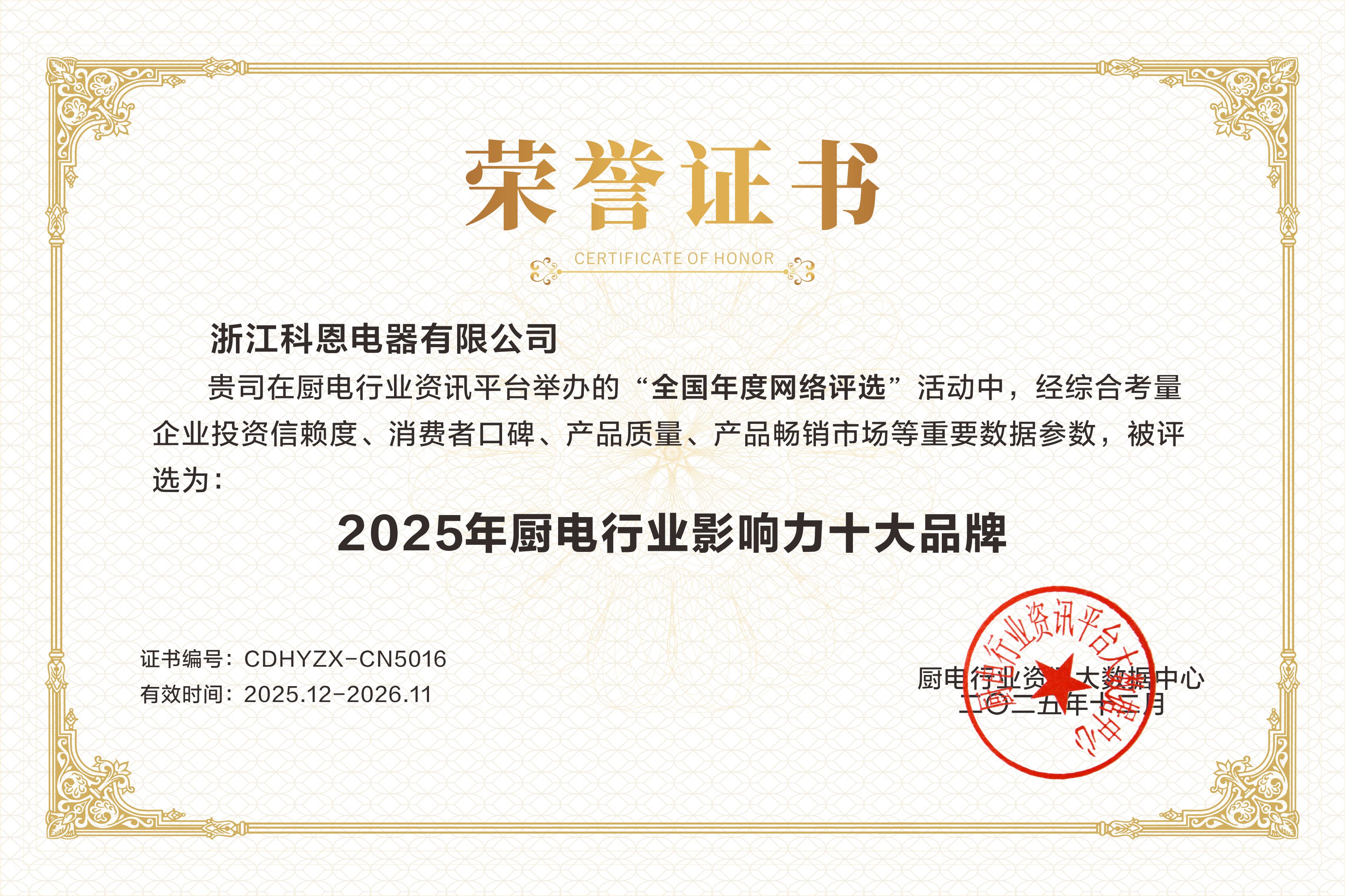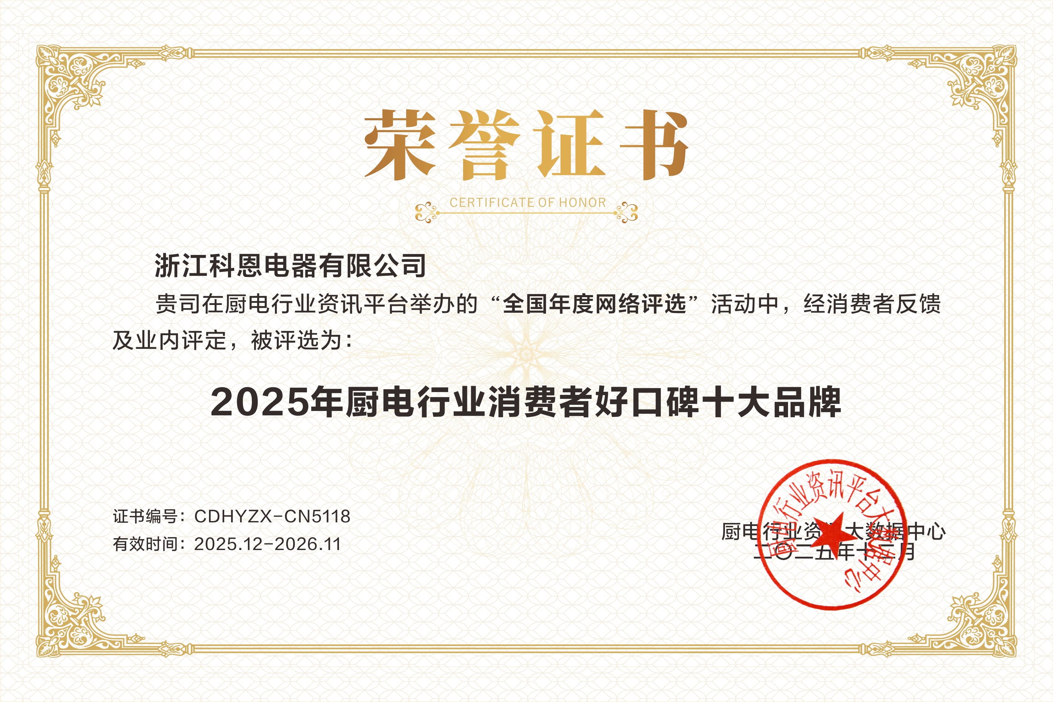 每一次獲獎,都是對過去的總結,更是對未來的承諾。科恩電器感謝每一位用戶的信賴與選擇,感恩行業(yè)伙伴的認可與同行。站在新的高度,科恩將承載這份榮耀與期待,繼續(xù)秉持匠心與創(chuàng)新精神,不僅致力于提升中國家庭的廚房生活品質,更愿與行業(yè)一同成長,共同推動廚電產業(yè)邁向更高水平的發(fā)展征程。