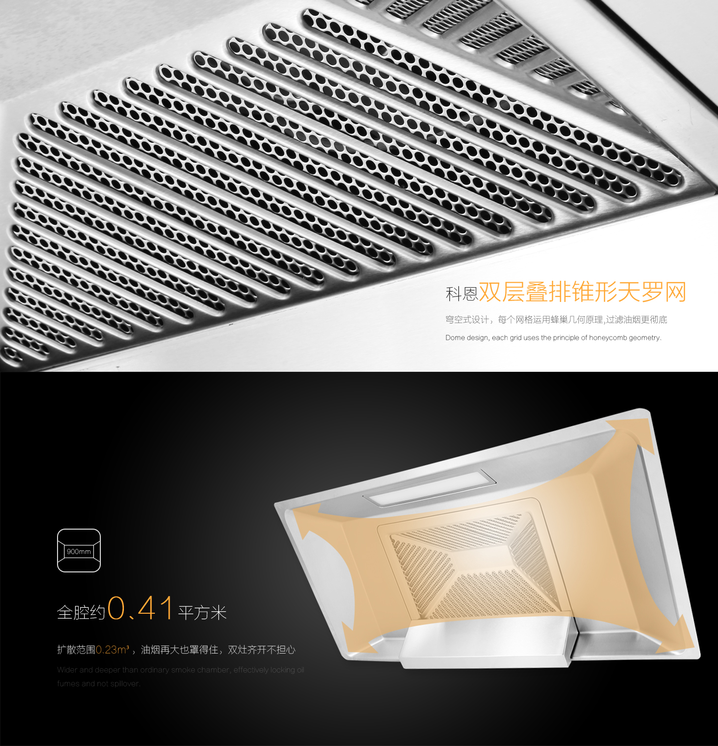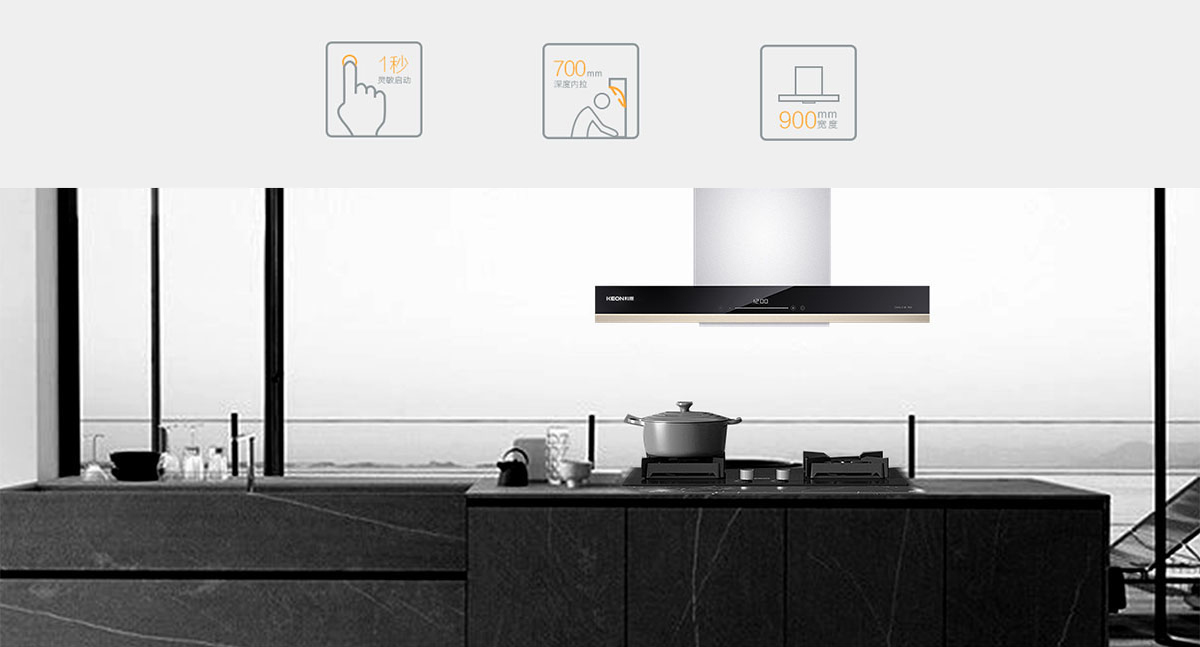全腔900MM攏煙區(qū),比普通煙腔更寬更深,有效鎖住油煙不外溢。