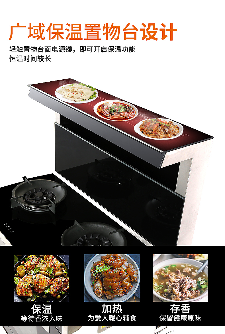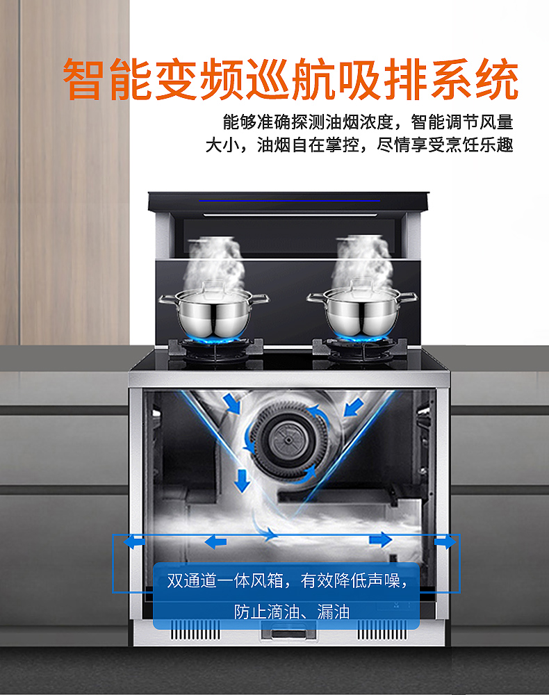 - 智能巡航吸排系統,準確探測油煙濃度,智能調節風量大小。