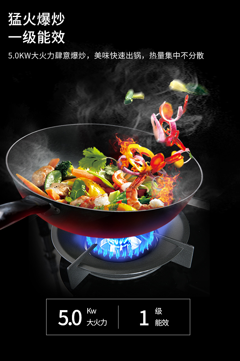 - 精控勁火,1級能效,5.0KW大火力肆意爆炒,美味快速出鍋。