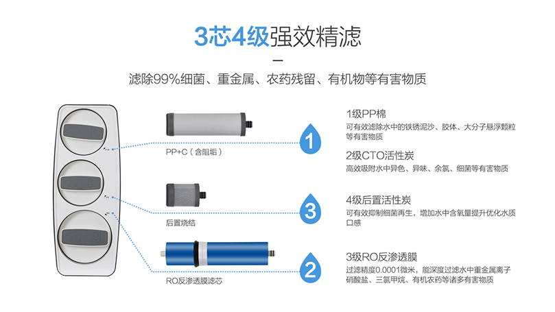 三芯四級強效精濾,濾除99%細菌重金屬