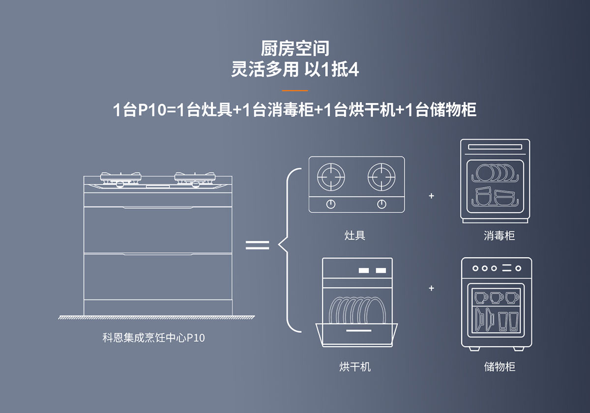 以1抵4,1臺P10=1臺灶具+1臺消毒柜+1臺烘干機+1臺儲物柜