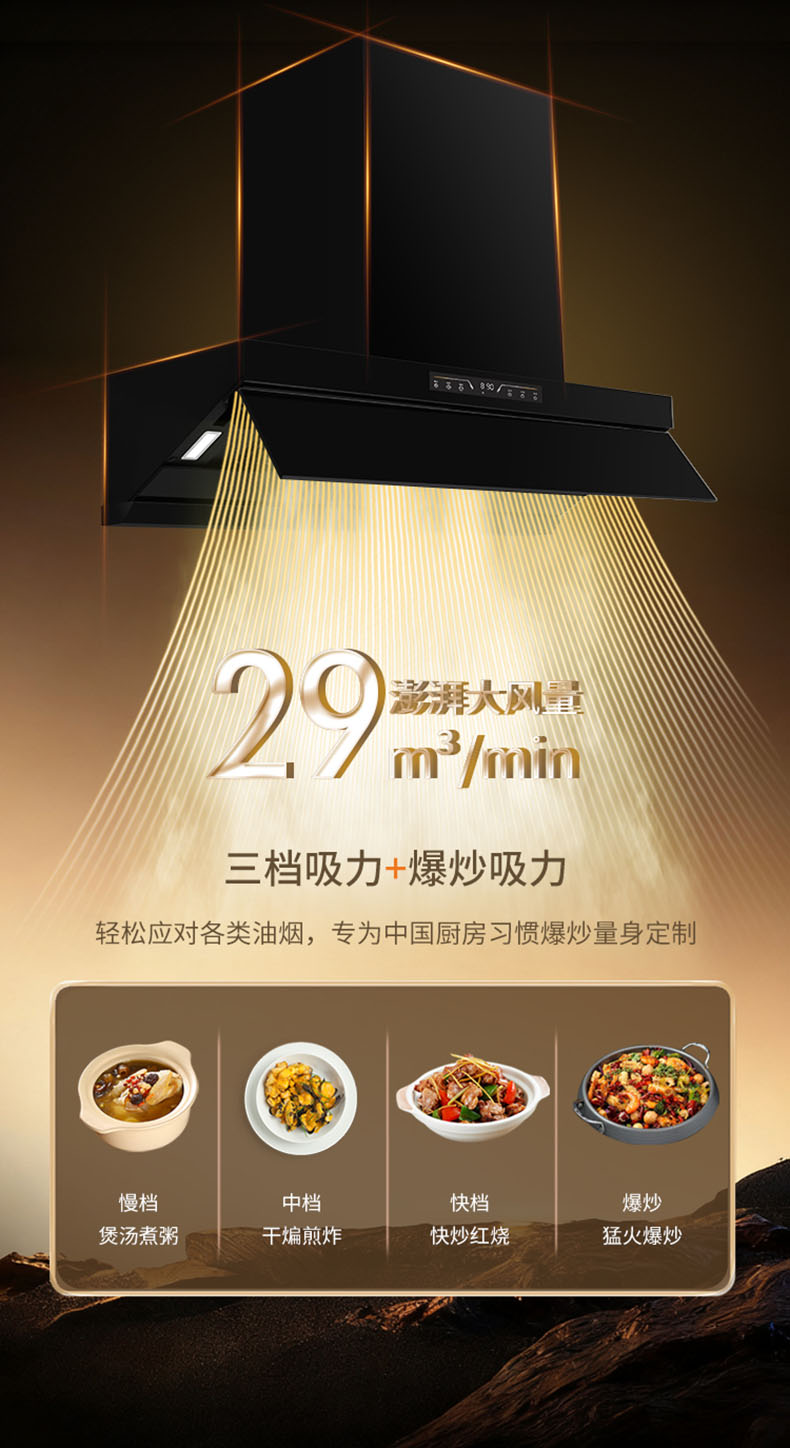 - 29m³/min澎湃大吸力,烹飪?nèi)虖N房空氣清爽