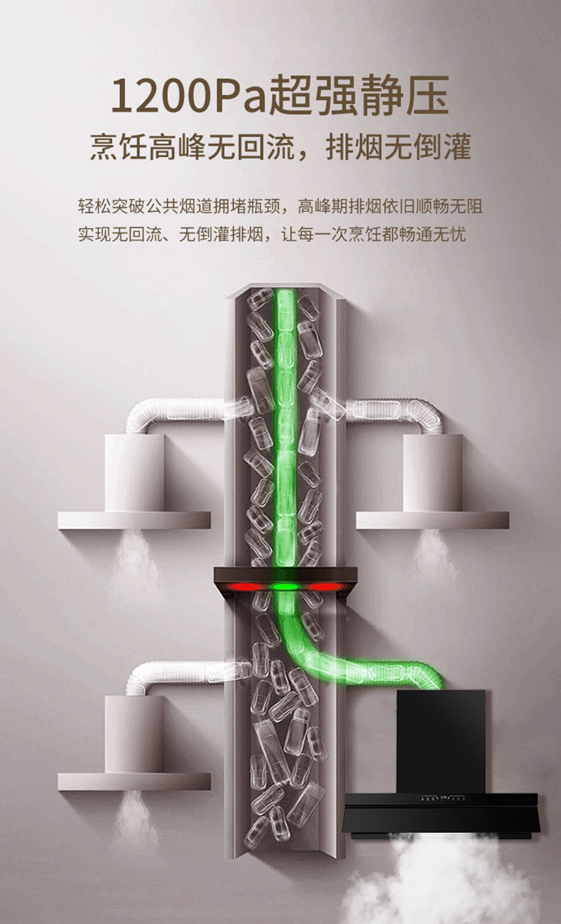 - 1200Pa超強(qiáng)靜壓,烹飪高峰無回流,排煙無倒灌