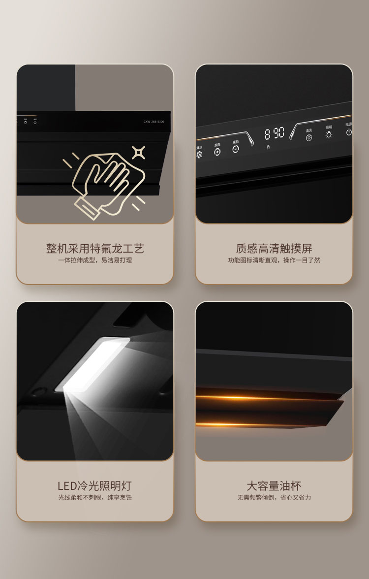 - 2min延時凈吸,徹底清除廚房內(nèi)殘余油煙