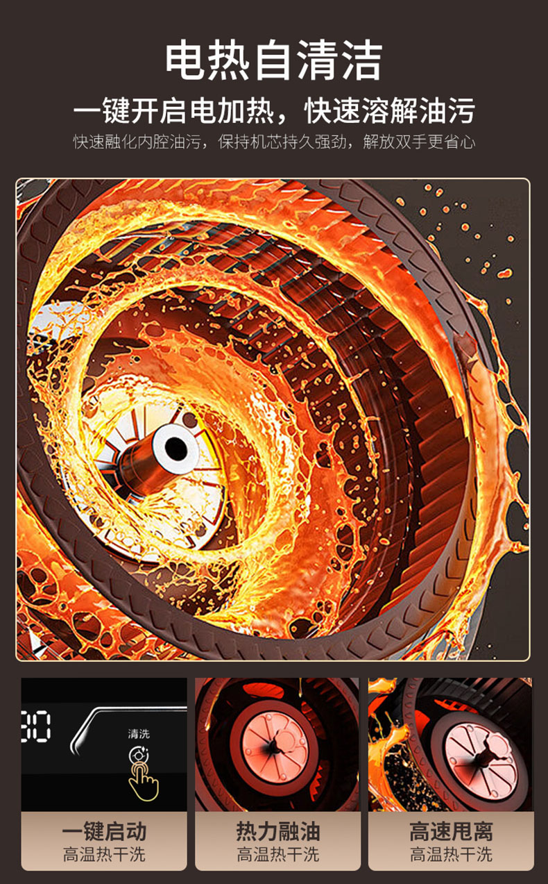 - 電熱自清潔,一鍵開啟電加熱,快速溶解油污